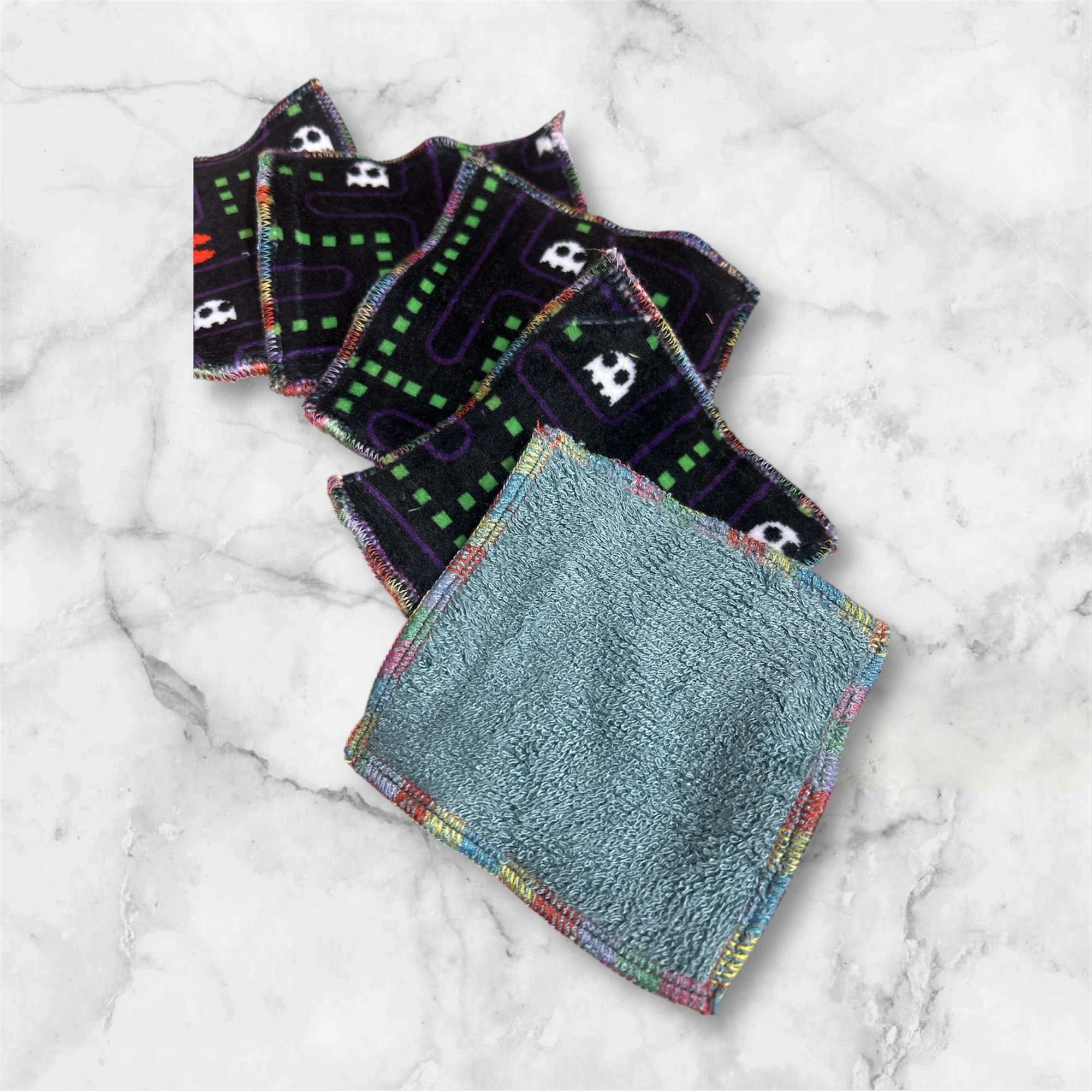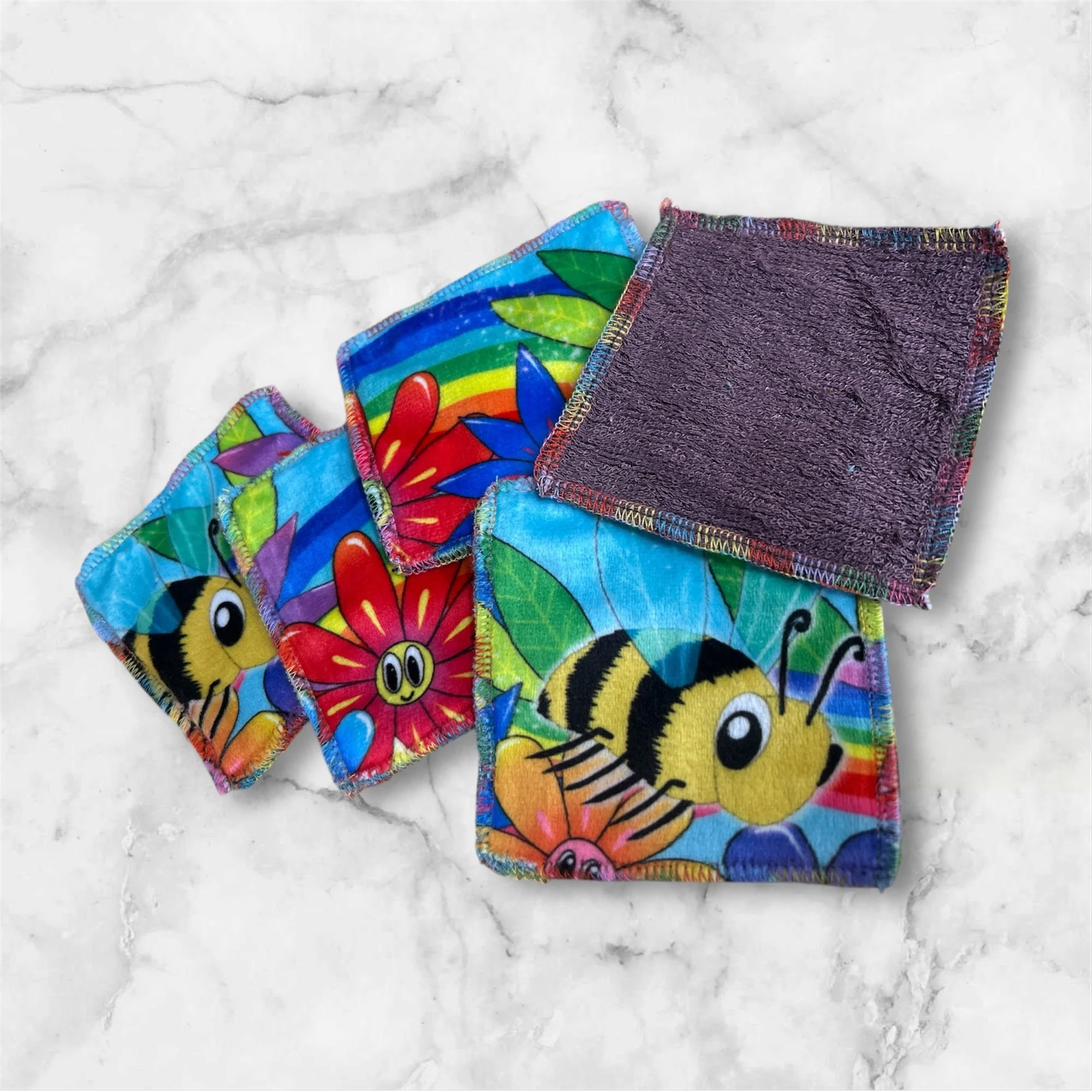 Dual-Sided: Colourful scrap fabric on one side, soft organic bamboo terry on the other ; gentle on skin, tough on messes.